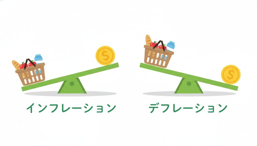 インフレを正しく理解するためには、その対義語である「デフレ」との違いを知ることが必要です。日本は長年デフレに悩まされてきた歴史があり、多くの人がデフレ経済に慣れ親しんできました。しかし、インフレとデフレでは経済や私たちの生活に与える影響が大きく異なります。ここでは、両者の違いと、それぞれが持つメリット・デメリットを解説していきます。