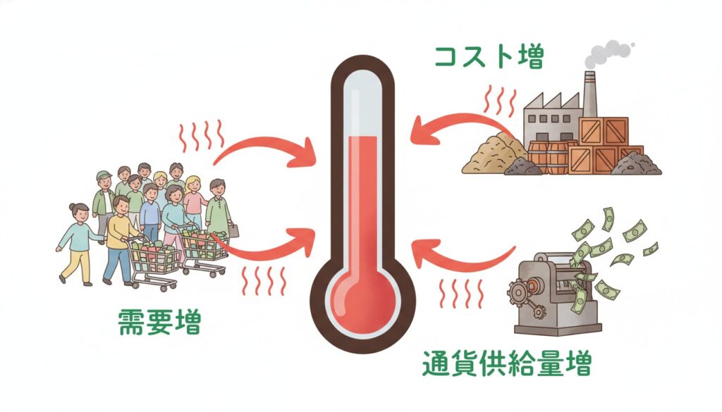 インフレが発生する理由は複雑ですが、大きく分けて3つの主な原因があります。それぞれを理解することで、なぜ今インフレが起きているのかが見えてきます。